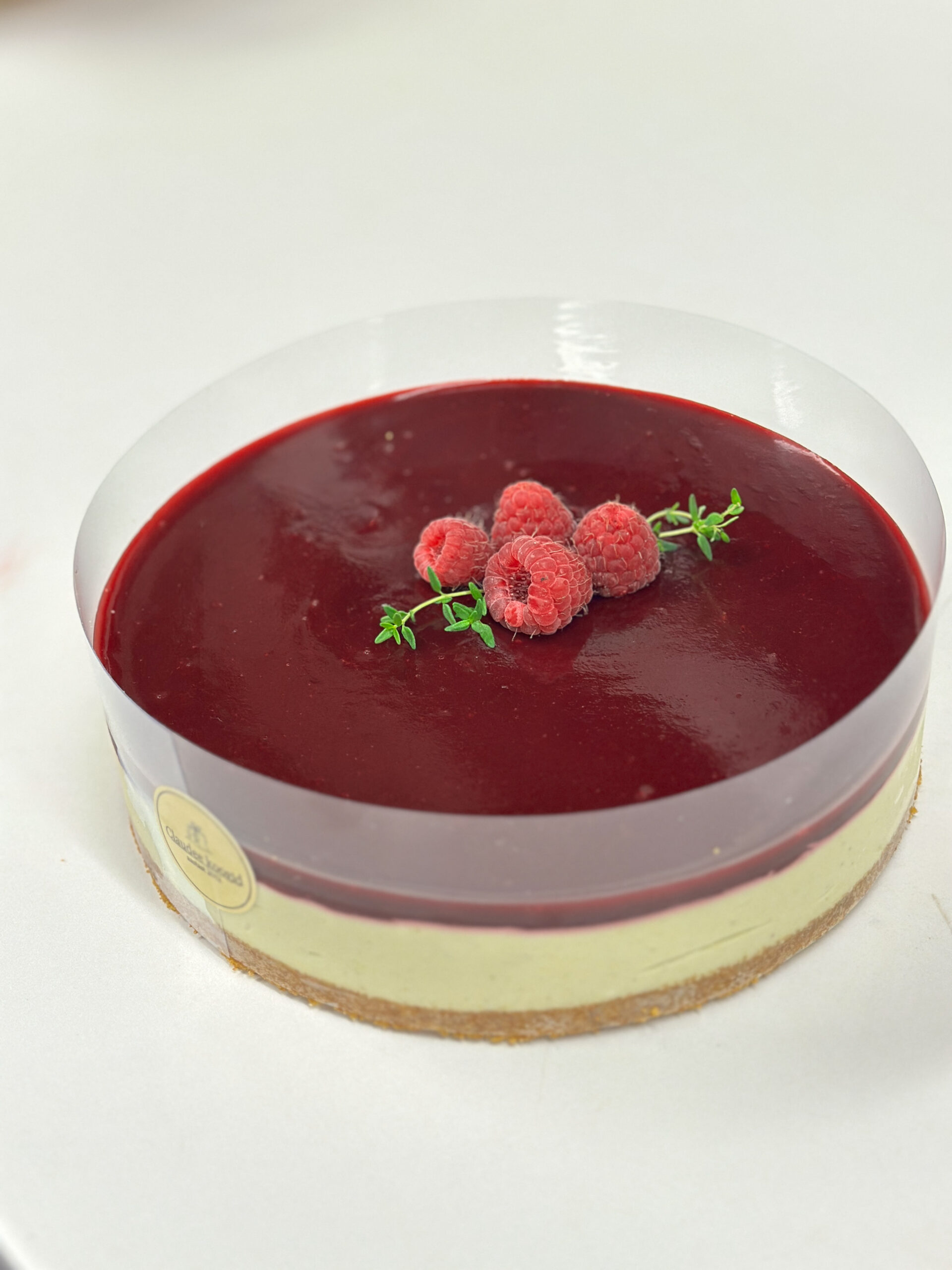 Digestive küpsisepõhjal maheda maitsega pistaatsia toorjuustukreem ja katteks hapukas vaarikapüree (zellatiiniga)
